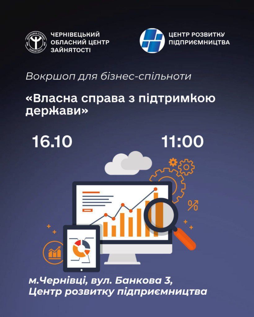 Чернівецький обласний центр зайнятості та Центр розвитку підприємництва запрошують підприємців та тих, хто планує розпочати бізнес, на воркшоп, де можна дізнатися про державну грантову програму «Власна справа» для створення та розвитку бізнесу.